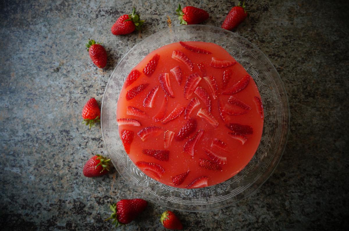 En este pastel encontramos una base de anacardos tostados, una capa interior de nata (crema de leche) y mascarpone con fresas troceadas, una capa de fresa y finalmente una gelatina de fresas.