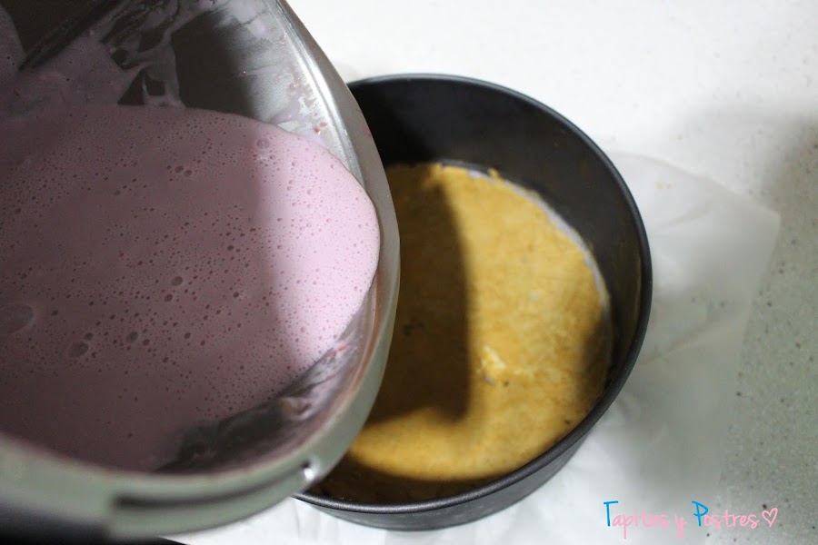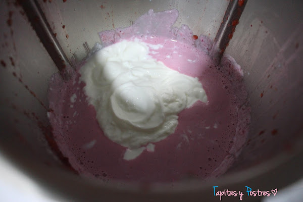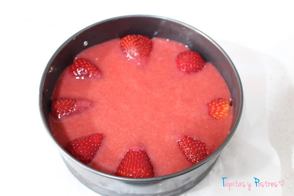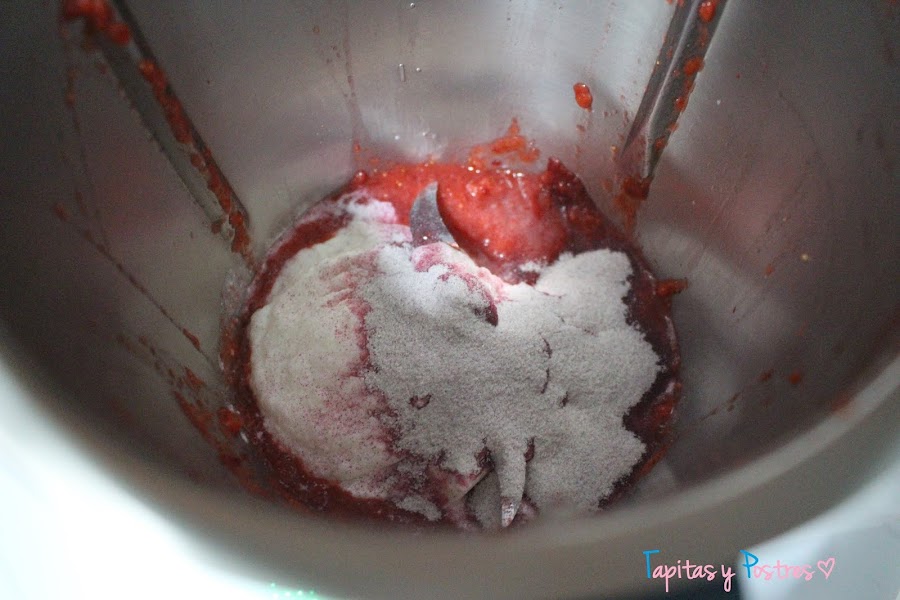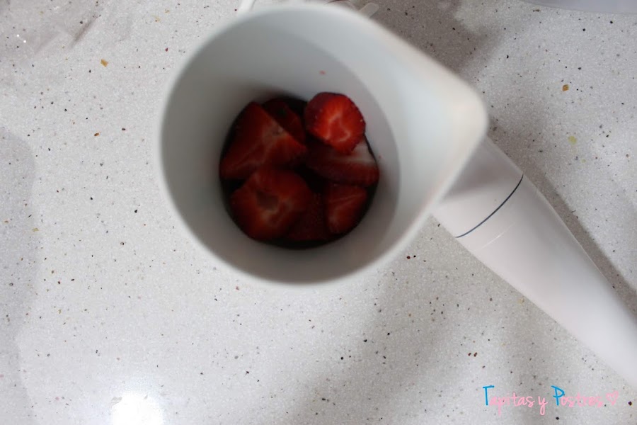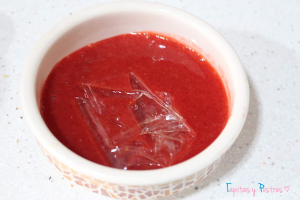 Cuando la tengamos bien cuajada, haremos la cobertura. Ponemos la hoja de gelatina a hidratar en agua fría. Trituramos las tres fresas, esta vez he usado una batidora. Le añadimos la gelatina hidratada y escurrida y calentamos en el microondas 30 segundos. Mezclamos bien.