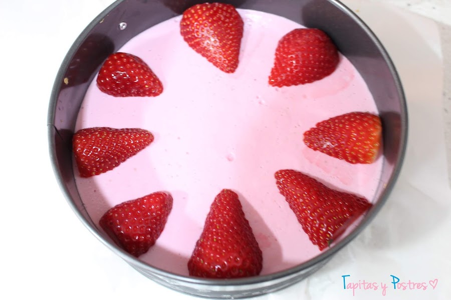 Ponemos mitades de fresas en la tarfa para adornar.