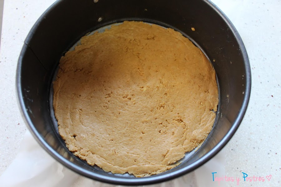 La ponemos en el fondo de un molde de 18 cm. Os advierto que es una pasta que cuesta extender. No os desepereis. Dejamos en el congelador.