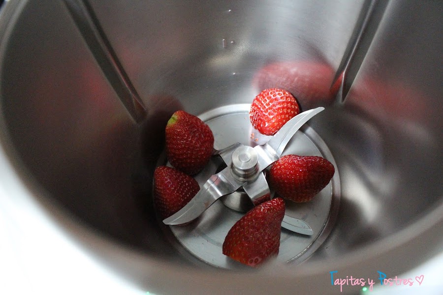 Ponemos las fresas y las trituramos 10 segundos a velocidad 8-10. Añadimos 250 gr del queso batido desnatado, y el sobre de gelatina de fresa. Mezclamos 10 segundos a velocidad 3 y programamos 4 minutos, 70º y velocidad 2. Al acabar, agregamos el resto del queso batido desnatado y la cucharadita de sacarina liquida. Mezclamos de nuevo 10 segundos a velocidad 3.
