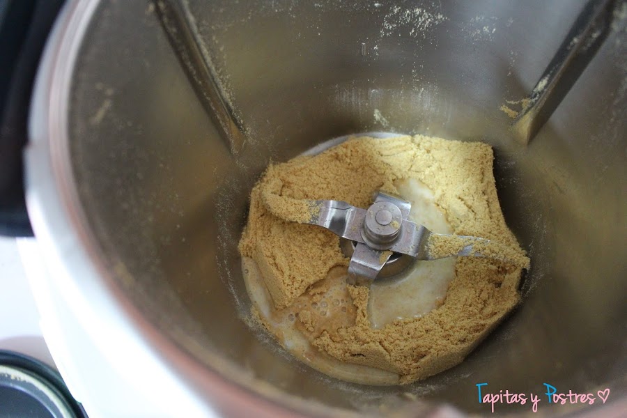 Comenzamos triturando las galletas en la thermomix 10 segundos a velocidad 10. Podemos hacerlo con una batidora. Añadimos la leche y mezclamos 10 segundos a velocidad 3. Ponemos esta mezcla en el fondo de un molde de 18 cm. He de advertiros que sale una pasta que cuesta extender. Pero con paciencia lo conseguiremos.