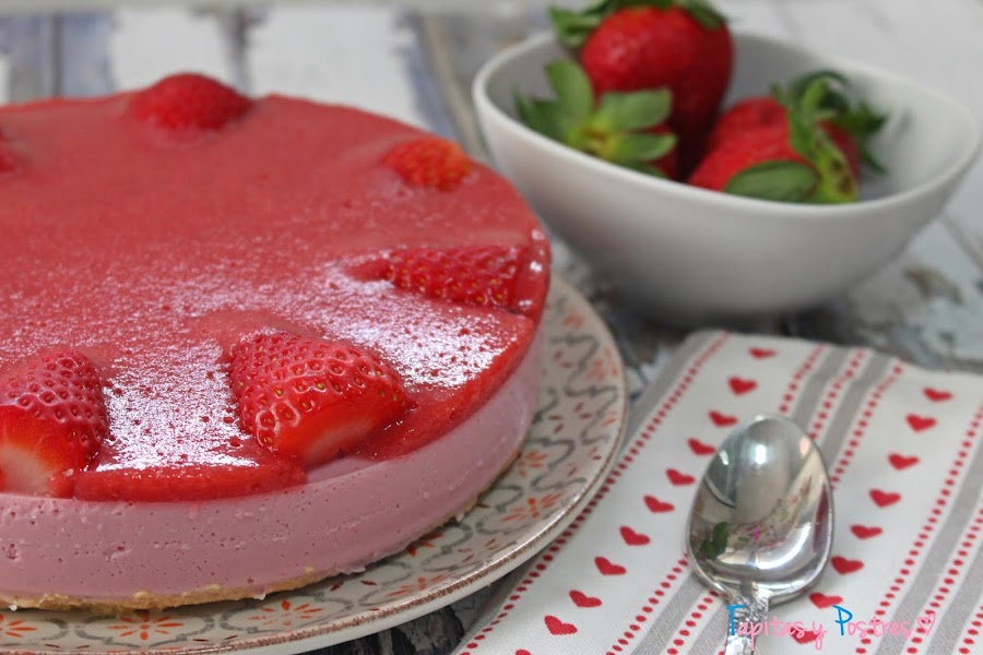 Partimos por la mitad las cuatro fresas y las colocamos sobre la tarta. Encima echamos la cobertura de fresa y gelatina. Dejamos en la nevera hasta que se cuaje, un par de horas más. Estas tartas es conveniente hacerlas el día anterior.