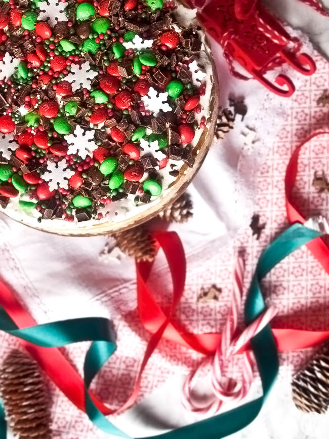 - Como toque final le he puesto grageas de chocolate verdes, marrones y rojas; copos de nieve de oblea, nonpareils rojos y verdes y trocitos de chocolate.