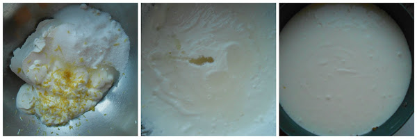 En un bol agregar el yogurt, el queso cremoso, el azúcar y la ralladura de limón. Mezclar bien e incorporarle la gelatina disuelta en agua. Removemos bien. Retiramos el molde con la base de galletas del congelador y volcamos la mezcla del relleno.