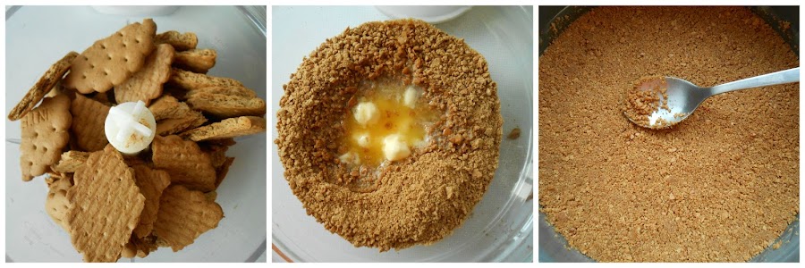 Triturar las galletas en una procesadora, si no tenemos, podemos ponerlas dentro de una bolsa limpia y darle golpes con un rodillo hasta triturarlas bien. Añadir la mantequilla derretida y mezclar bien hasta que quede como arena mojada.