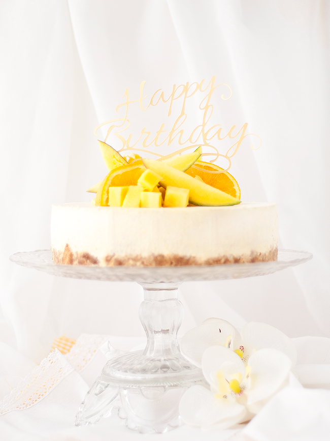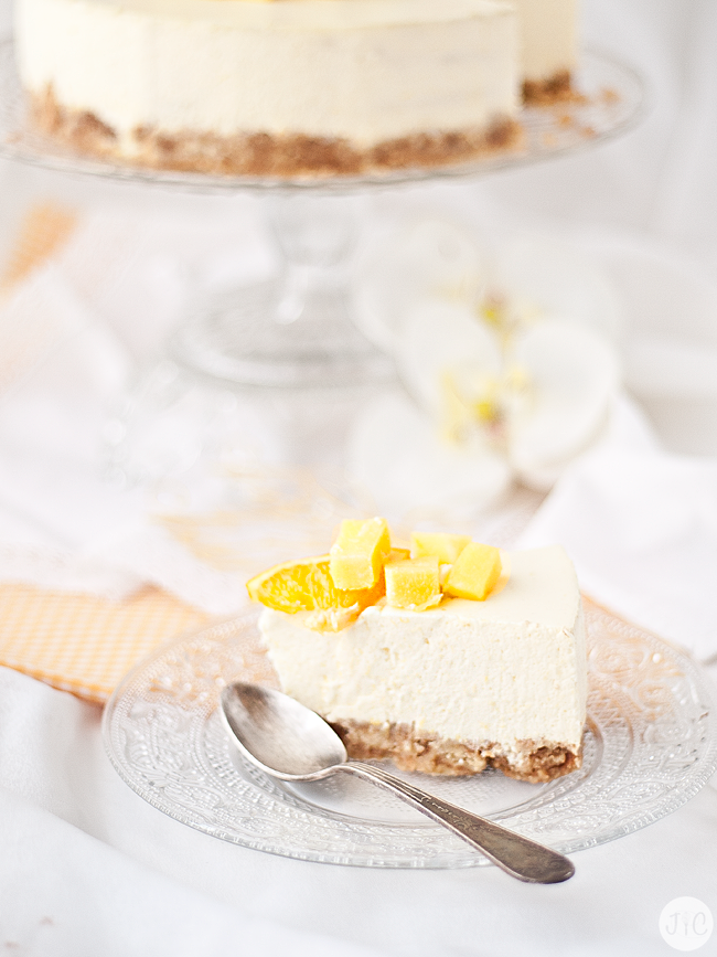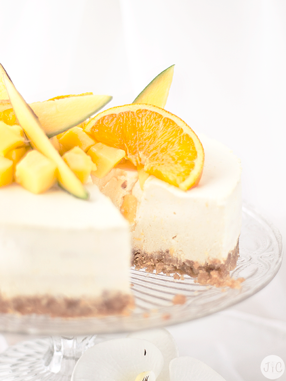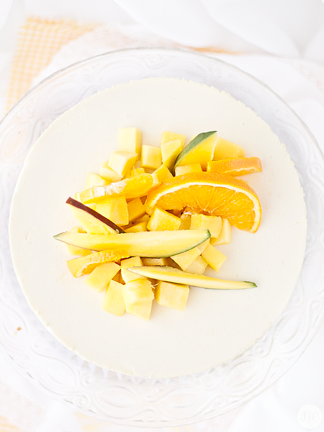Le ha dado un toque de frescura mayor al que ya de por sí tiene la tarta de queso fría. Además he evitado glaseados, para darle un toque más sano, y la he acompañado de trozos de frutas, en este caso de mango y naranja, las dos protagonistas de la tarta. Creo que le dan un toque fantástico. ¡Os dejo la receta y espero que os guste!