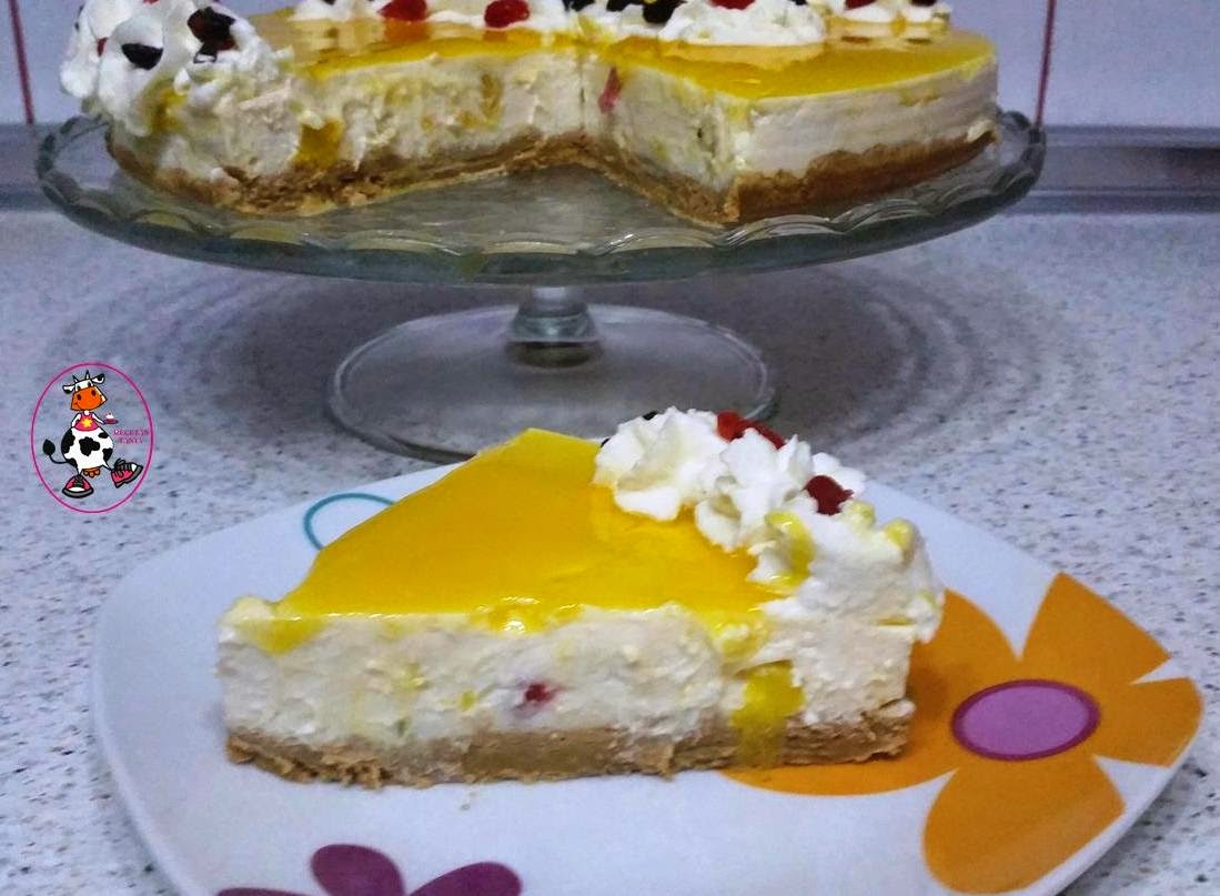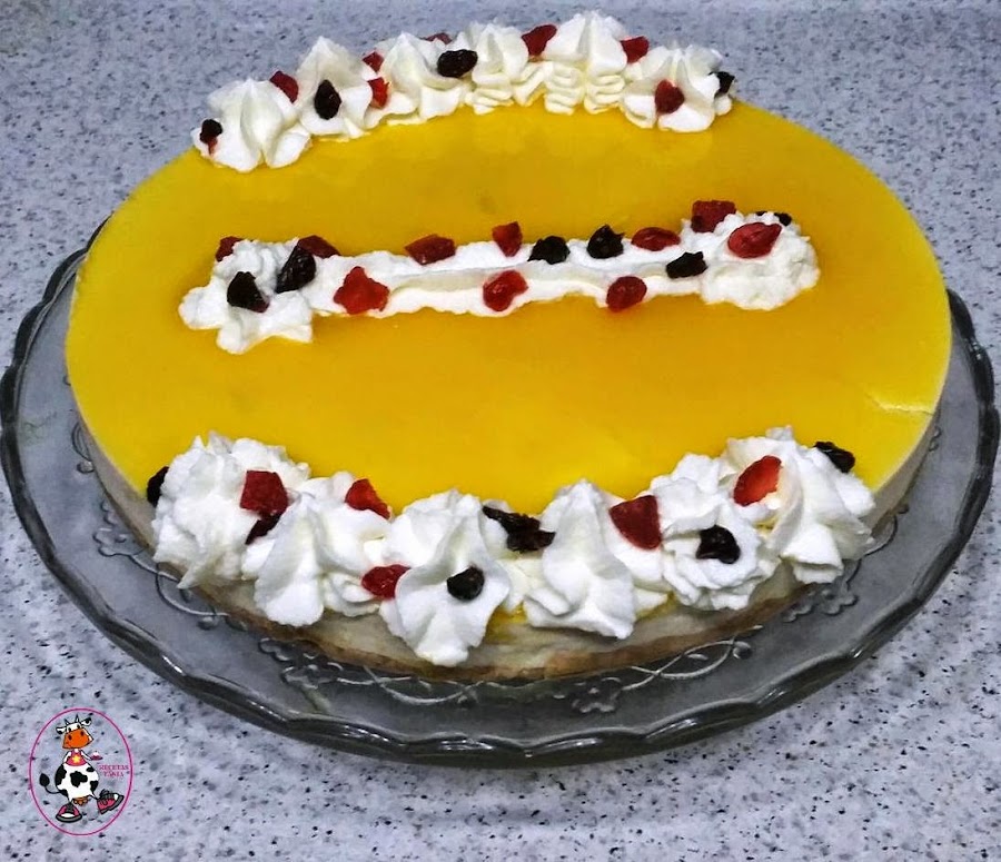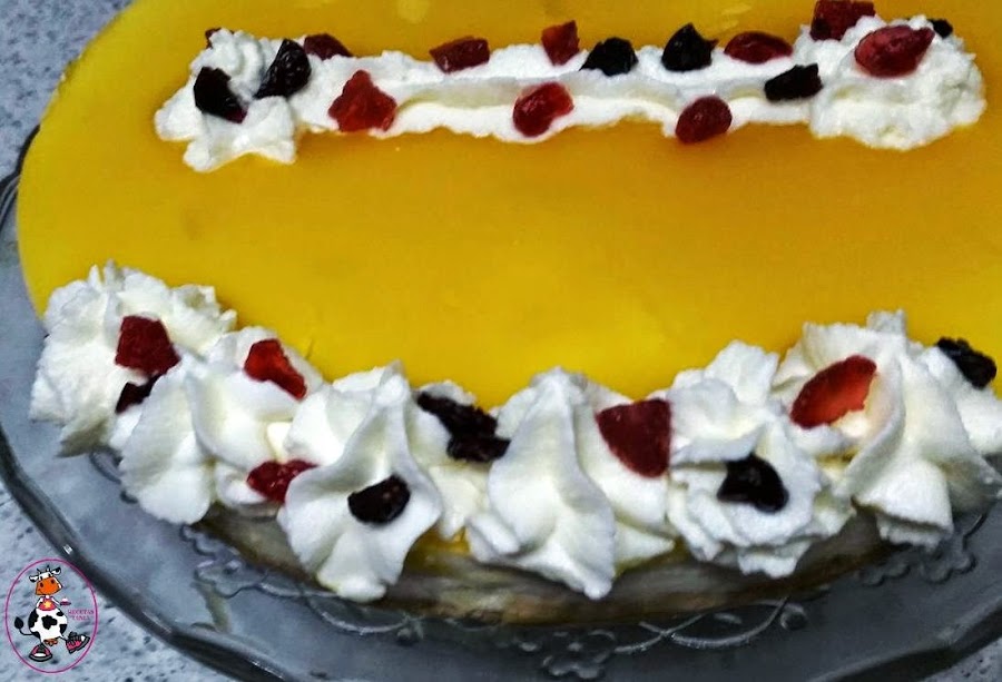 Pelamos el otro mango y lo ponemos en la batidora,cuando este bien triturado lo pasamos por un colador y luego se lo añadimos a la tarta por encima,ponemos un poquito de nata (crema de leche) y unos frutos rojos por encima y listo.