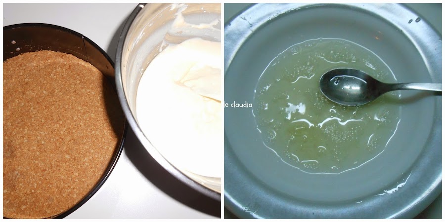 Triturar las galletas y mezclar con la margarina. Poner en el molde engrasado y hornear 8 minutos, horno precalentado a 180ºC