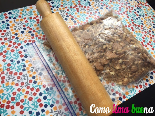 Triturar las galletas. Podés hacerlo como lo hice yo utilizando una bolsa ziploc y un palote de madera, o podés colocar las galletas en la procesadora.
