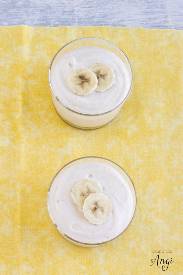 Por último con la ayuda de una espátula incorporamos la nata (crema de leche) al bol con el queso y el plátano y con las varillas batimos otro poquito.