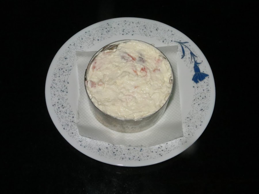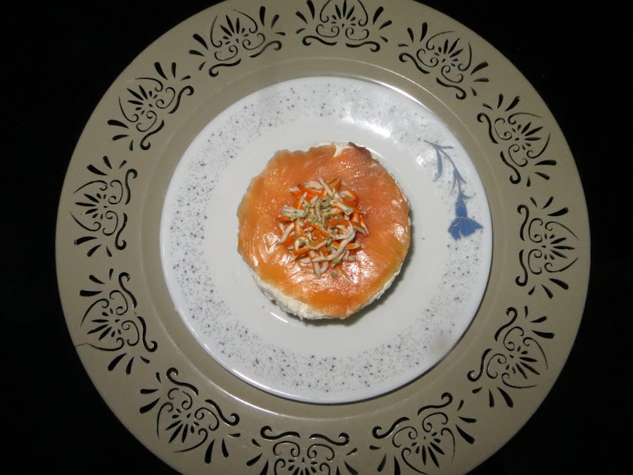 En una batidora o con un tenedor mezcláis el queso crema y el queso feta, añadís 75 gramos de salmón ahumado en trocitos y un poco de pimienta. Lo echáis encima de la base de galletas y lo metéis por cuatro horas en el frigorífico, justo antes de servirlo, le ponéis una lámina de salmón ahumado, añadís un poco de surimi rallado en el centro para decorar y un poco de orégano y ya está listo para servir.