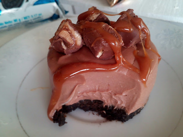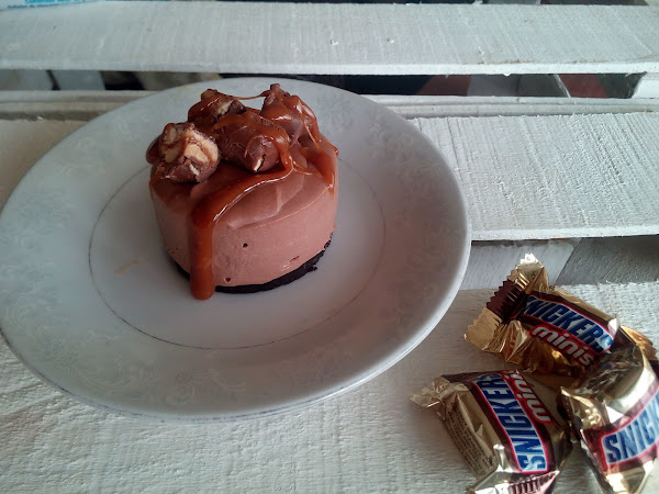 Listo!! ya solo nos queda desmoldar presionando hacia arriba y decorar con los snickers y caramelo líquido (puedes ponerle más de todo lo que quieras, a mi en la foto se me pasó ponerle el chocolate líquido)