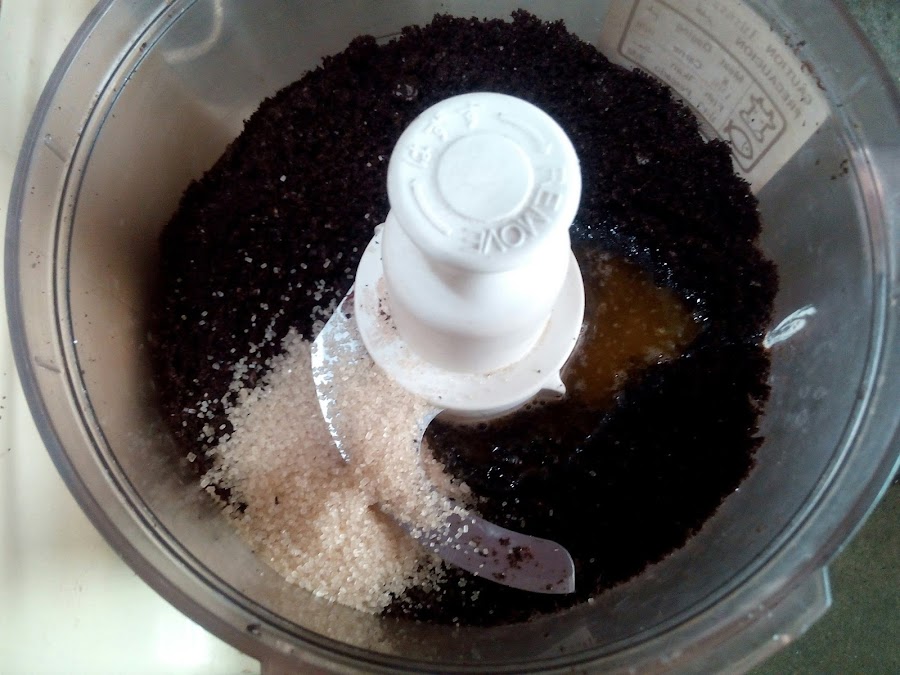 Comenzamos con la base. Trituramos las galletas y mezclamos con el azúcar y la mantequilla.