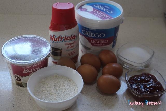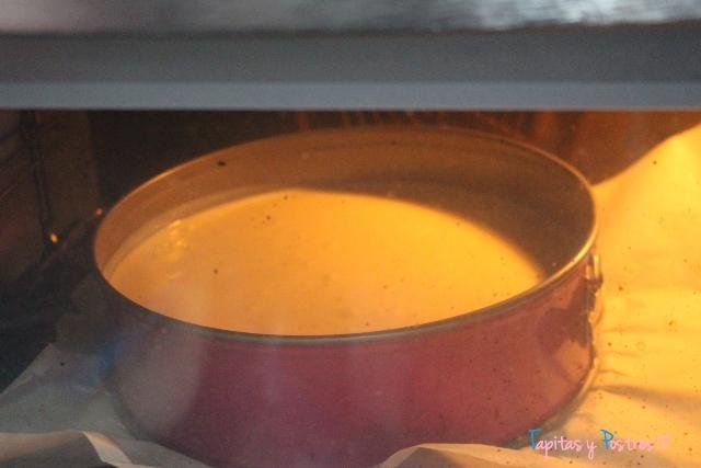 Al horno, calor arriba y abajo con ventilador si tenéis. 180º durante 45 o 50 minutos. Luego dejamos dentro del horno con la puerta entreabierta hasta que temple y a continuación dejamos en la nevera unas horas (yo la dejé toda la noche) para antes de servir, cubrir con mermelada de fresa o de cualquier sabor que os guste.