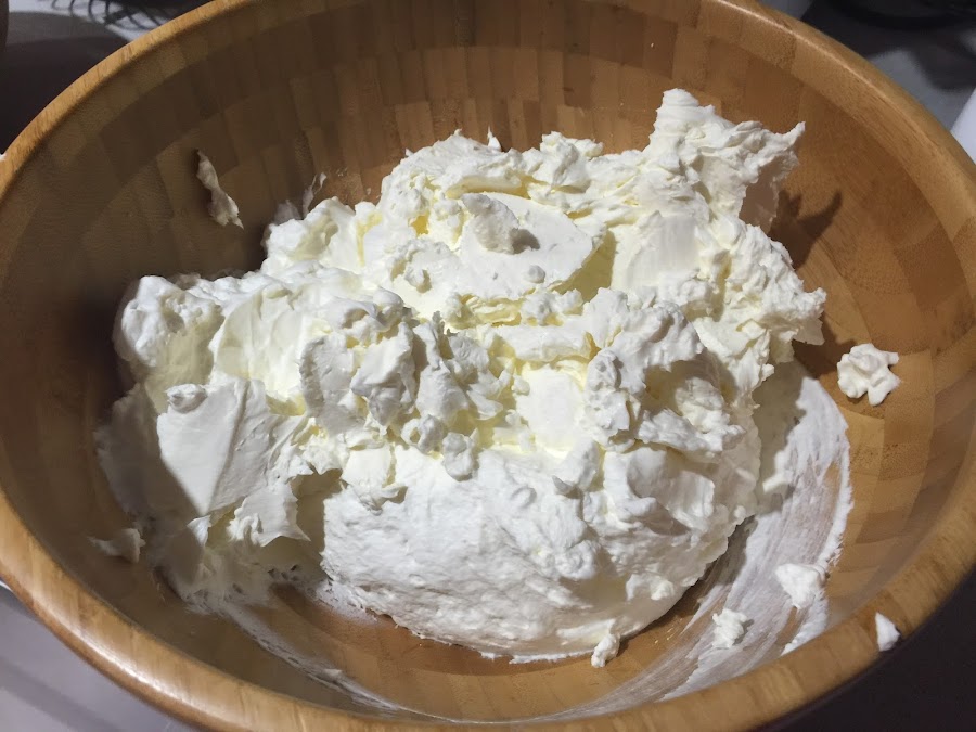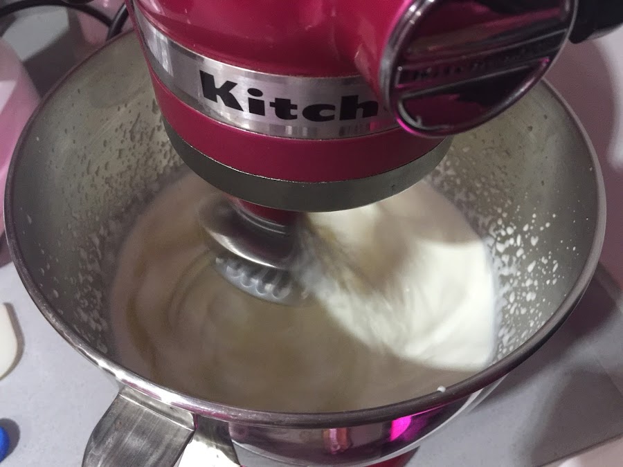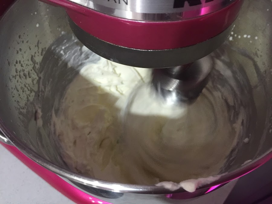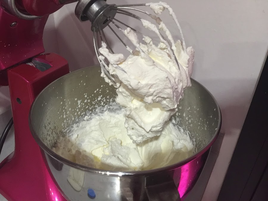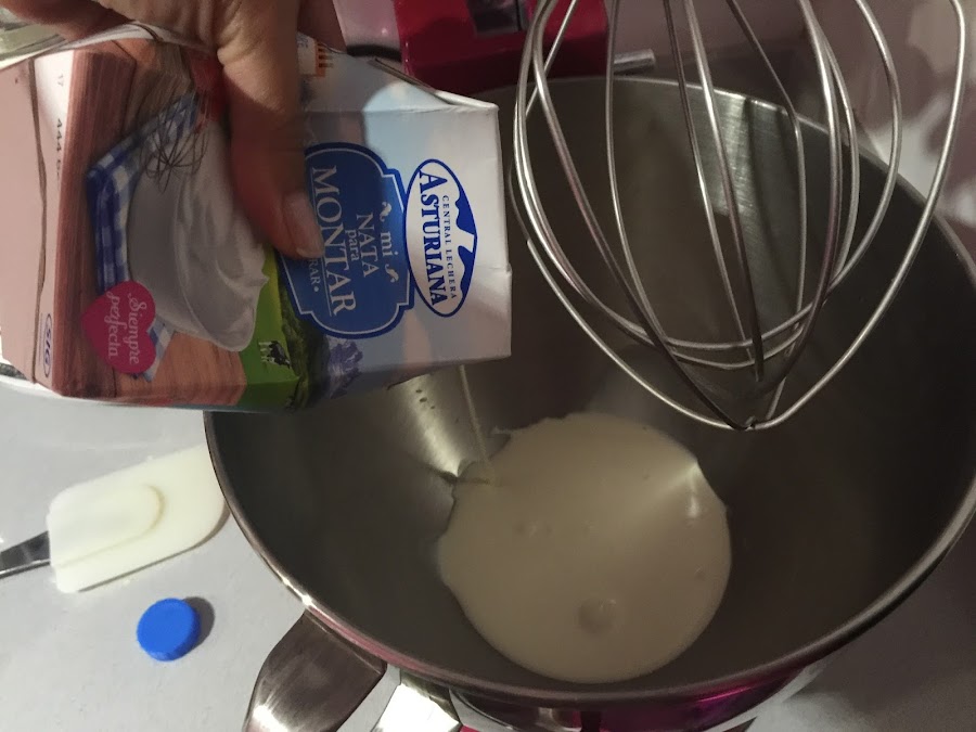 2. Colocamos los 500ml de nata (crema de leche) para montar, importante que esté muy fría, en el bol de la KA. Batimos a velocidad alta hasta que la nata (crema de leche) monte, añadimos la cucharada de azúcar y acabamos de montar, cuidado con no pasarse y que se convierta en mantequilla. Reservamos la nata montada (crema de leche) en un recipiente en la nevera.