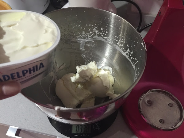 3. Colocamos los 500g de queso philadelphia en el bol de la KA, el queso al estar frío tiene una consistencia dura, va bien batirlo para que el proceso de mezclarlo con la nata (crema de leche) resulte más sencillo.