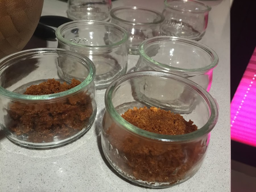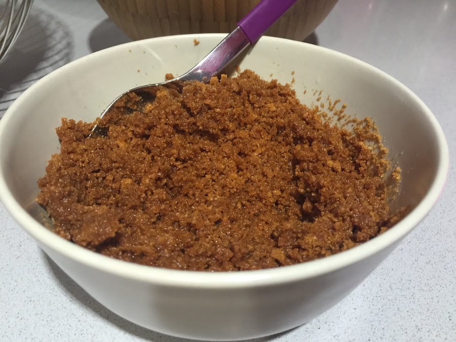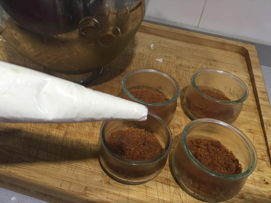 1. Empezamos triturando las galletas, no conviene que queden completamente molidas, porque siempre gusta encontrarse algún trocito. Siempre uso las speculoos para las bases de tartas y cheesecakes. Estas galletas son muy aromáticas con un sabor muy pronunciado a canela, me encantan. Una vez molidas las mezclamos con los 40g de mantequilla fundida. Una vez mezclado colocamos una cucharada sopera en cada vasito, presionamos con la cuchara bien para que quede fijado en la base. Refrigeramos los vasitos mientras preparamos el relleno.
