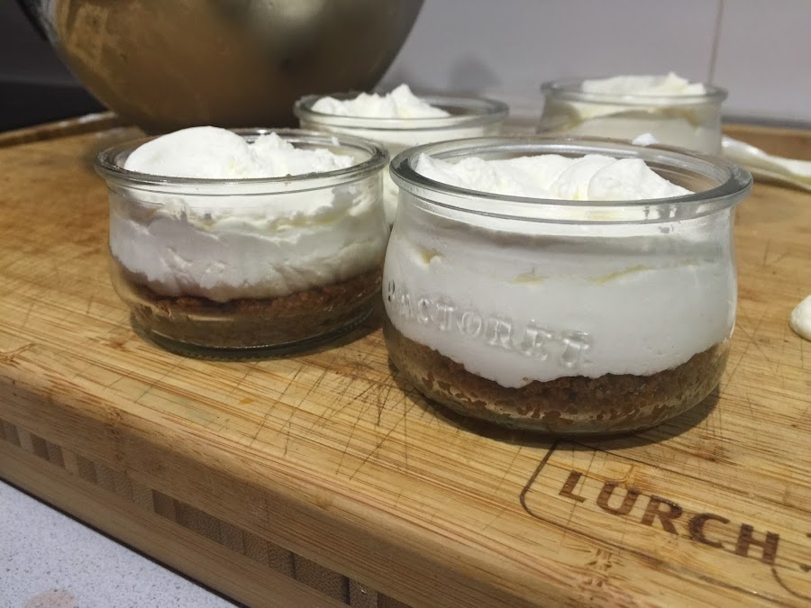 5. Colocamos la mezcla en una manga pastelera, con esta cantidad de masa da para rellenar dos mangas pasteleras. Podéis hacerlo sin manga, pero el emplatado no quedará tan bien. Cortamos la punta de la manga pastelera y con un movimiento circular rellenamos prácticamente todo el vaso, solo debemos dejar medio centímetro para la mermelada.
