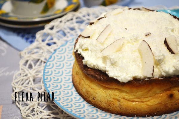 Extendemos un buen copete de esta crema sobre la tarta y espolvoreamos generosamente con coco rallado.