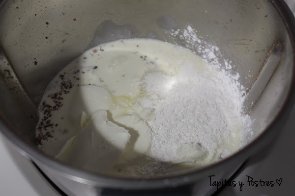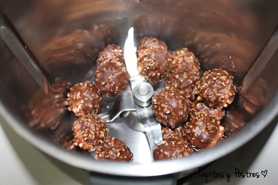 Mientras hacemos el relleno, ponemos los 15 bombones en el vaso de la thermomix y los trituramos 5 segundos a velocidad 8. Añadimos la nata (crema de leche), el queso, el azúcar y los sobres de cuajada y mezclamos 5 segundos a velocidad 6. Luego calentamos 8 minutos a 100º y velocidad 4. Esta mezcla se puede hacer en una cazuela calentando la mezcla a fuego suave y removiendo constantemente hasta que veamos que espesa.
