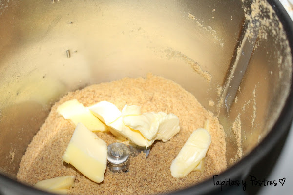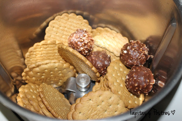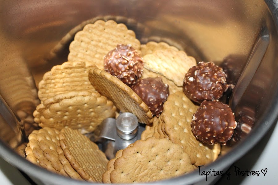 Primero preparamos la base triturando las galletas con los bombones 5 segundos a velocidad 8, si lo hacéis con thermomix. Sin thermomix también se puede hacer, usad una batidora eléctrica hasta convertirlo en polvo. Le añadimos la mantequilla y mezclamos 30 segundos a velocidad 5. Vertemos esta mezcla en el fondo de un molde desmoldable y aplastar bien. Dejamos en la nevera un ratito.