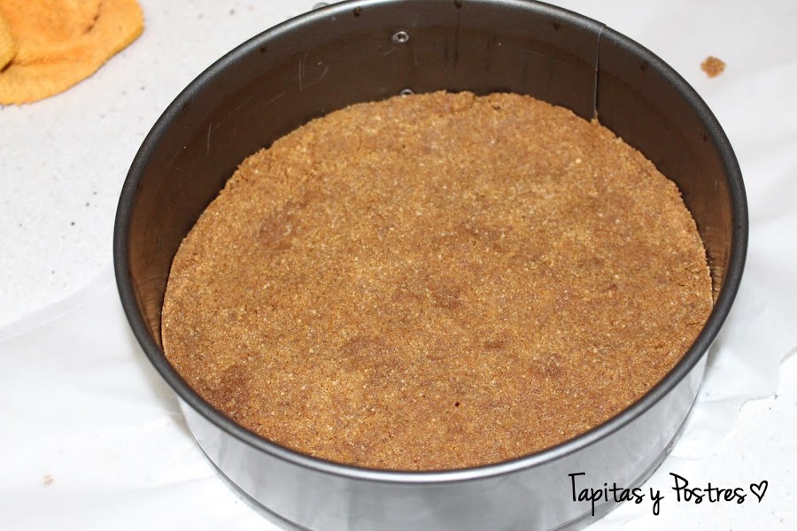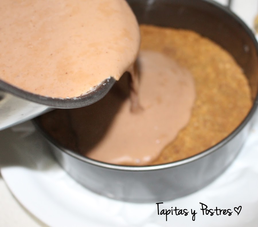 Vertemos la mezcla sobre la base de galletas. Y dejamos enfriar antes de guardarla en la nevera.