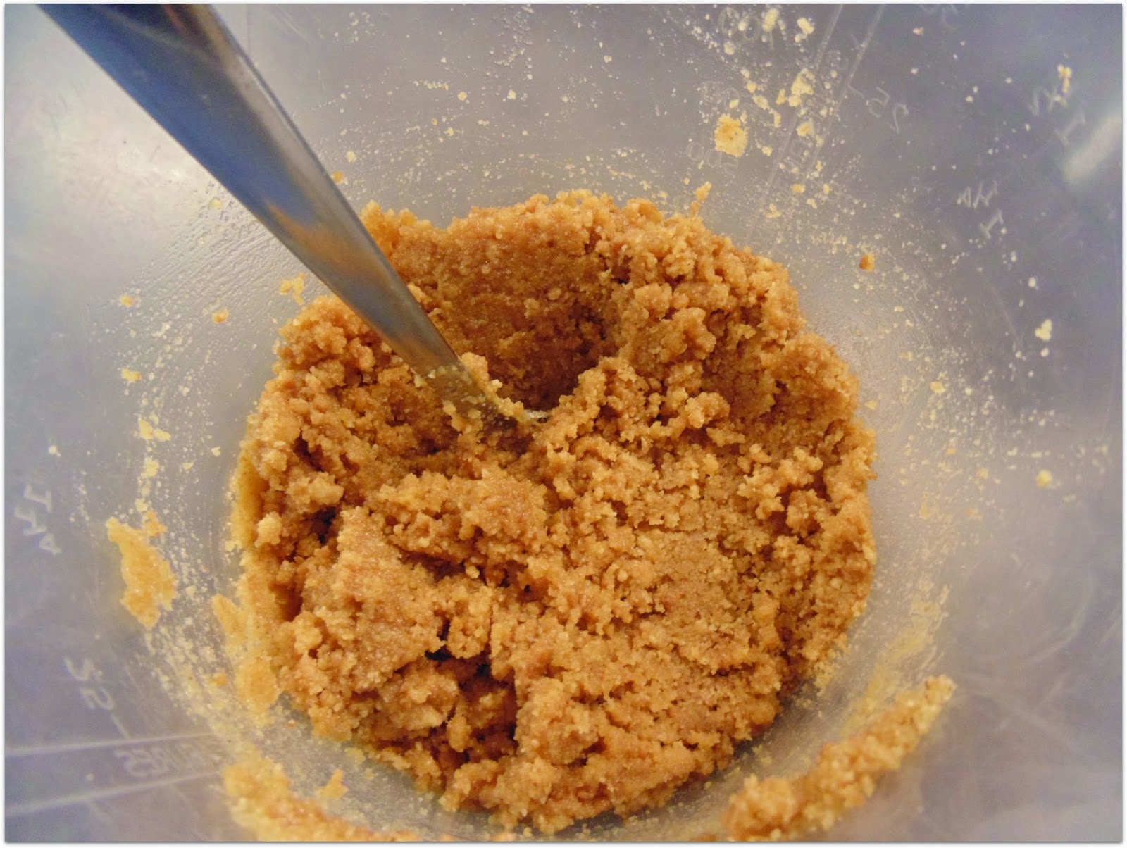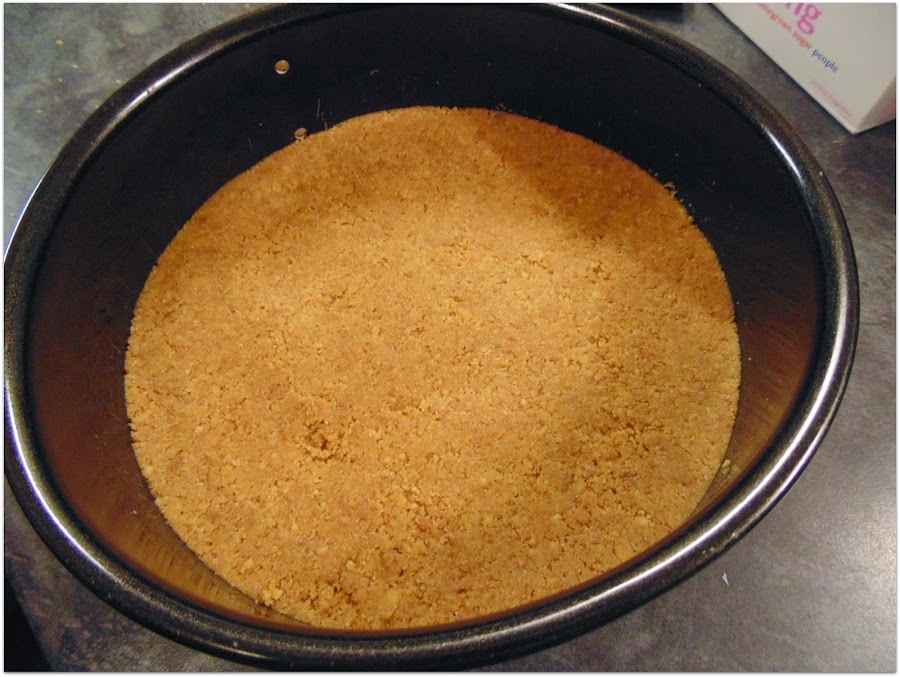 Comenzamos elaborando la base del pastel. Para ello, derretimos en el microondas la mantequilla y trituramos las galletas. Mezclamos en un recipiente y extendemos en un molde de 22 cm. hasta que quede uniforme.