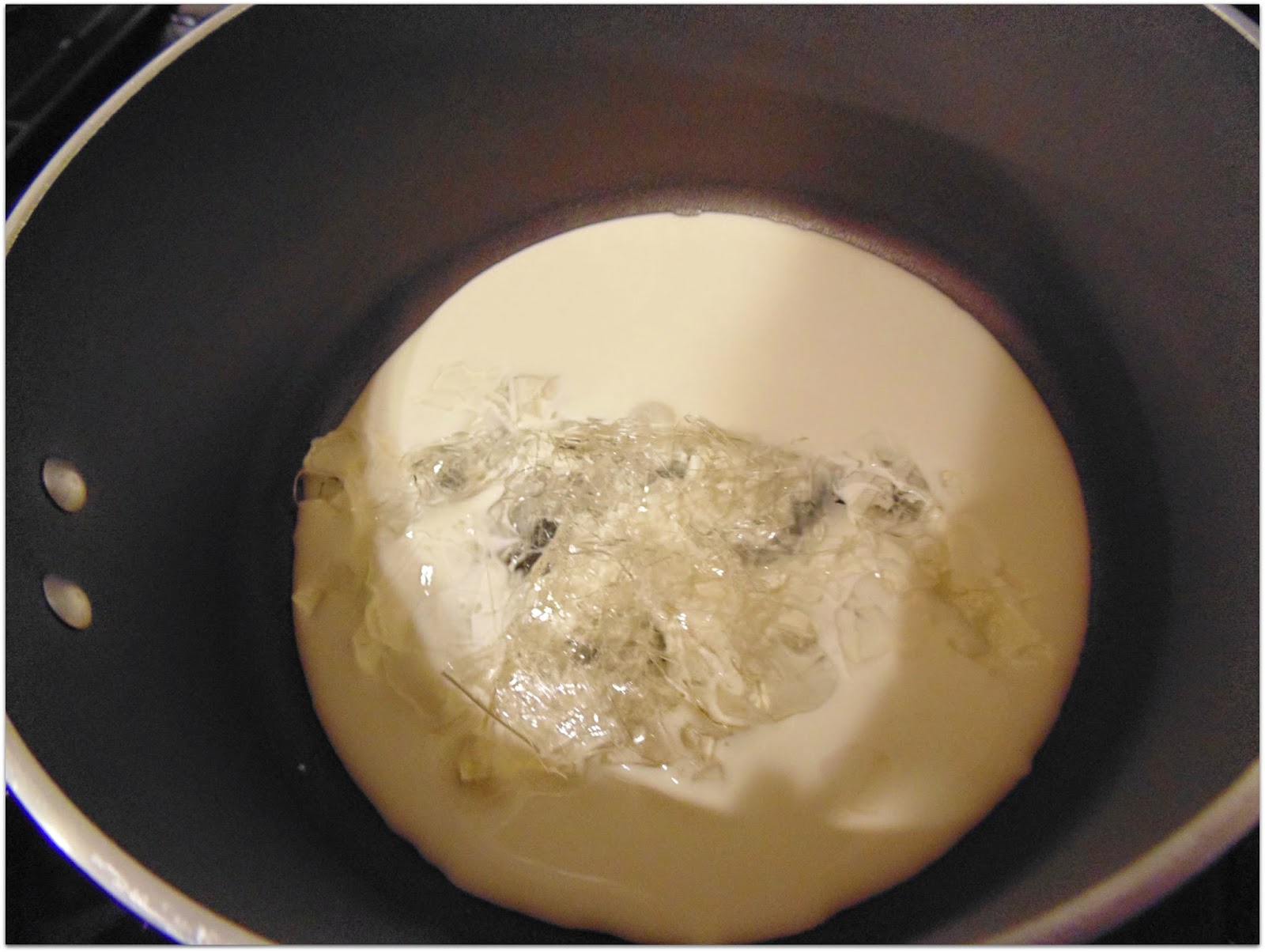 Una vez transcurridos los 10 minutos, calentamos las 4 cucharadas de nata (crema de leche) restantes sin que llegue a hervir y escurrimos y disolvemos la gelatina en ella. Removemos bien.