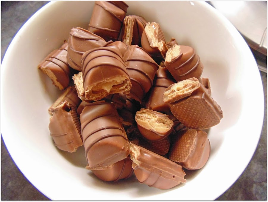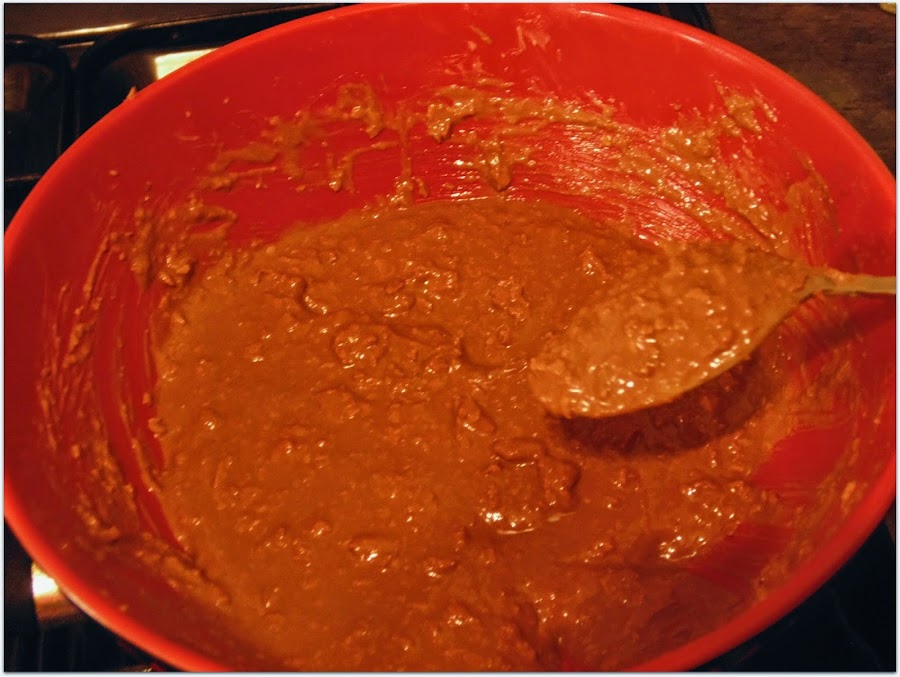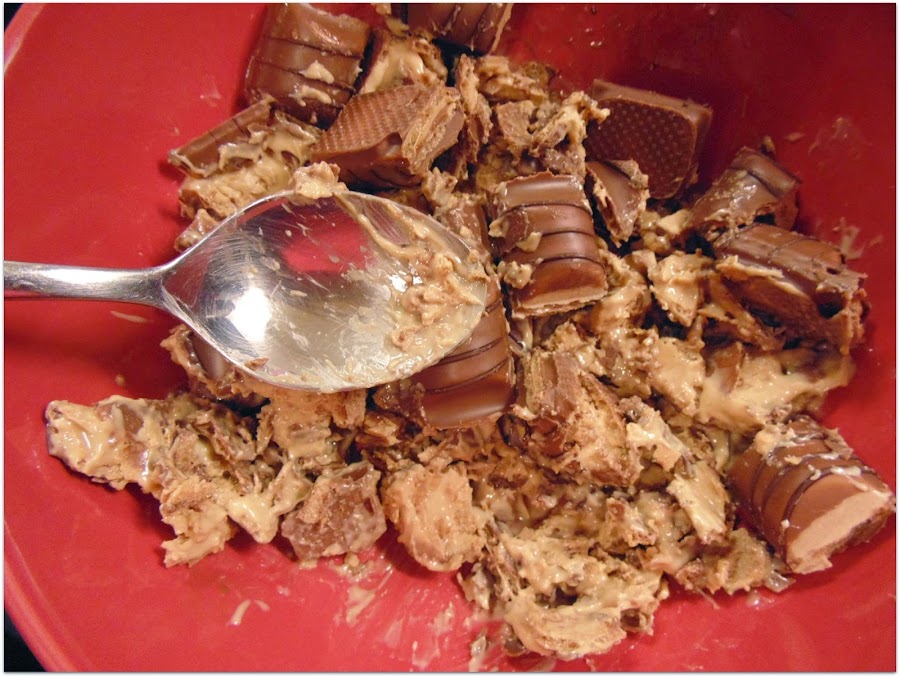 A continuación troceamos las barritas de kinder bueno (cuidado! que no se pierda algún trozo por ahí jeje). Y las ponemos a disolver al baño maría. Cuando empiecen a tomar temperatura las vamos triturando con ayuda de una cuchara o similar. Debe quedar hecho una pasta.