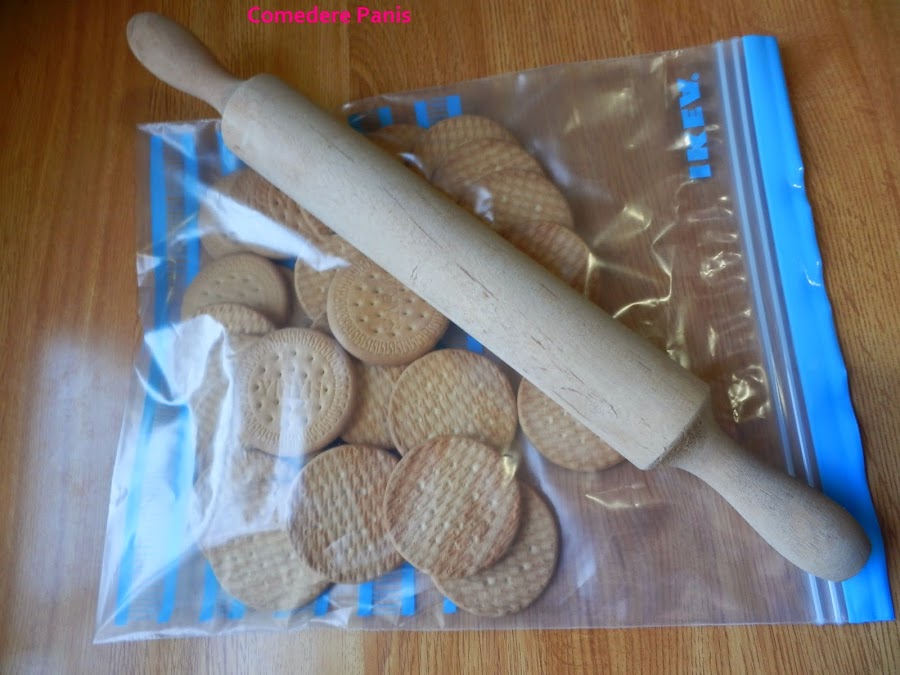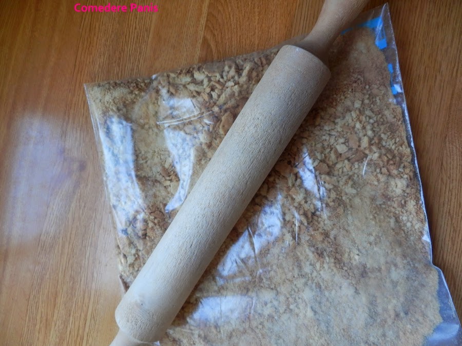 Comenzamos triturando las galletas, puedes hacerlo con un robot de cocina o si por el contrario deseas disfrutar y eliminar el estrés te aconsejo que coloques las galletas dentro de una bolsa de plástico, cierres bien la bolsa y con un rodillo muelas las galletas, Este método es estupendo porque eliminas tensiones y no ensucias ninguno de esos aparatos difíciles de lavar.
