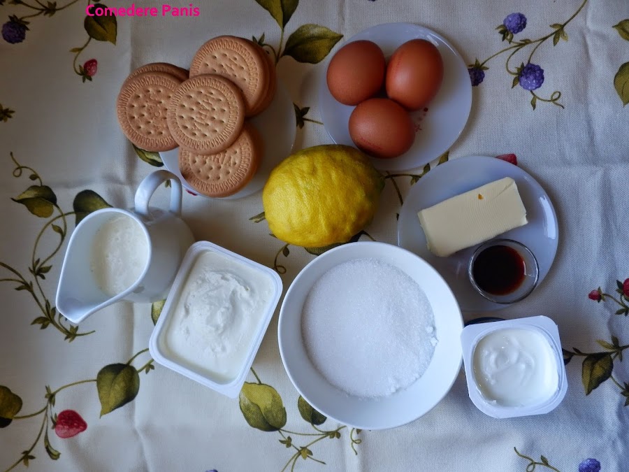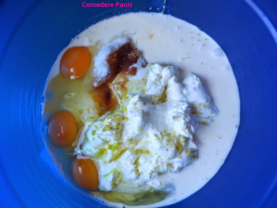 Coloca en un bol el queso, el yogur, la nata (crema de leche), el azúcar, los huevos, la ralladura de limón y la cucharilla de aroma a vainilla.