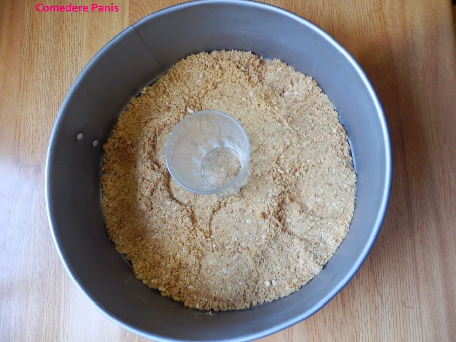 Aplasta muy bien las galletas, para ello puedes ayudarte de un vaso. Hornea la base de galletas durante 10 minutos a 150º C con esto conseguirás un sabor más intenso.