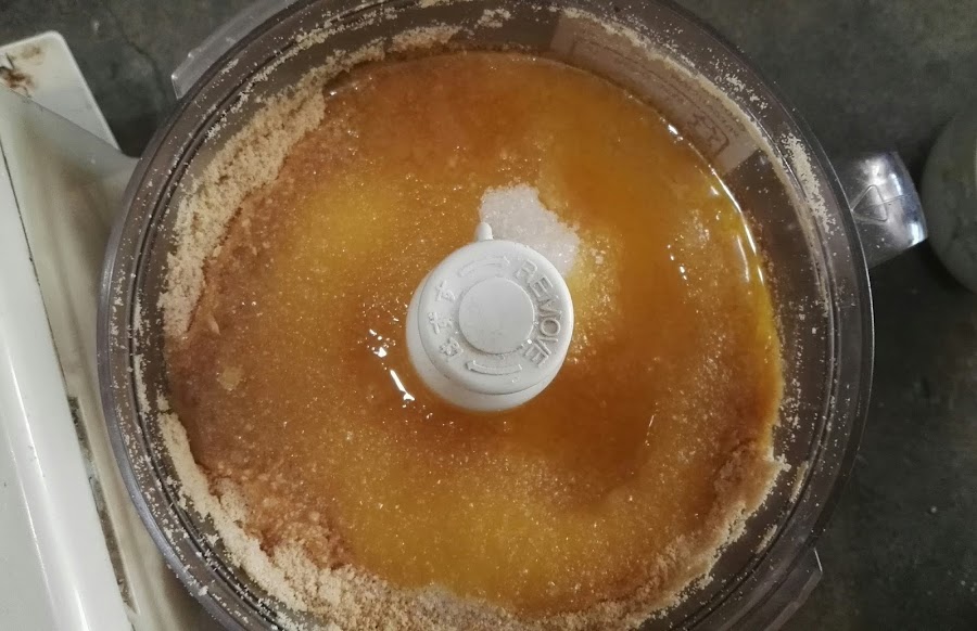 Trituramos las galletas en el procesador de cocina y mezclamos junto con los 100 gramos de azúcar y los 125 gramos de mantequilla derretida