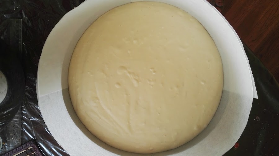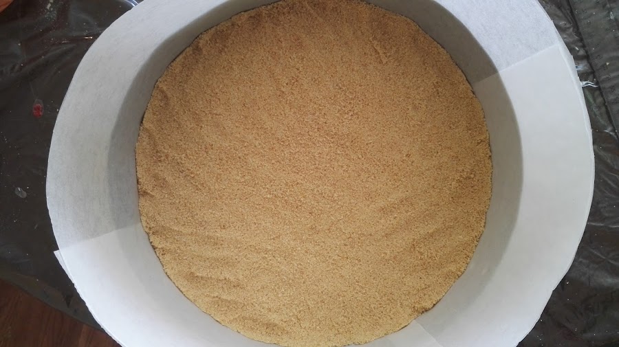 Vertimos sobre la base de galletas y horneamos a Baño María por 90 minutos a 200°C hasta que esté ligeramente dorado por las orillas, apagamos el horno pero NO lo sacamos y lo dejamos dentro por 90 minutos más hasta que se vaya enfriando.