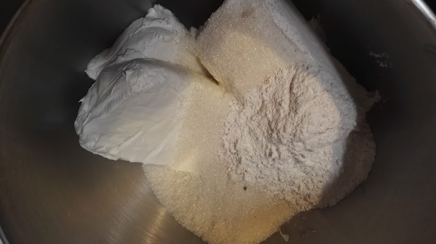 Mientras tanto comenzamos la preparar el cheesecake. Batimos juntos el queso crema, con el azúcar y la harina hasta que tenga una consistencia cremosa y sin grumos.