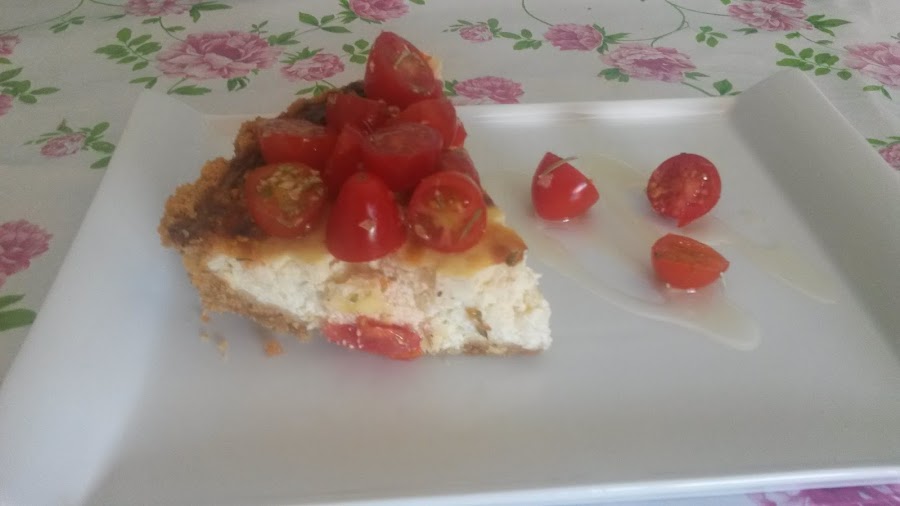 Aliñamos los tomatitos cherry a nuestro gusto y cubrimos la tarta con ellos una vez esté fria.