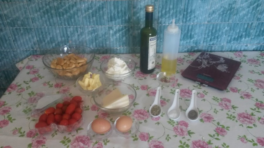 Las galletas para la base que suelen utilizarse son las saladas tipo Tuc, pero yo utilizaré unas galletas Quely que son típicas de aquí de las Islas Baleres. También hay una opción de confitar los tomatitos en el horno con sal y azúcar pero yo los voy a aliñar al estilo tradicional con sal, pimienta, ajo rallado y un poco de orégano seco.