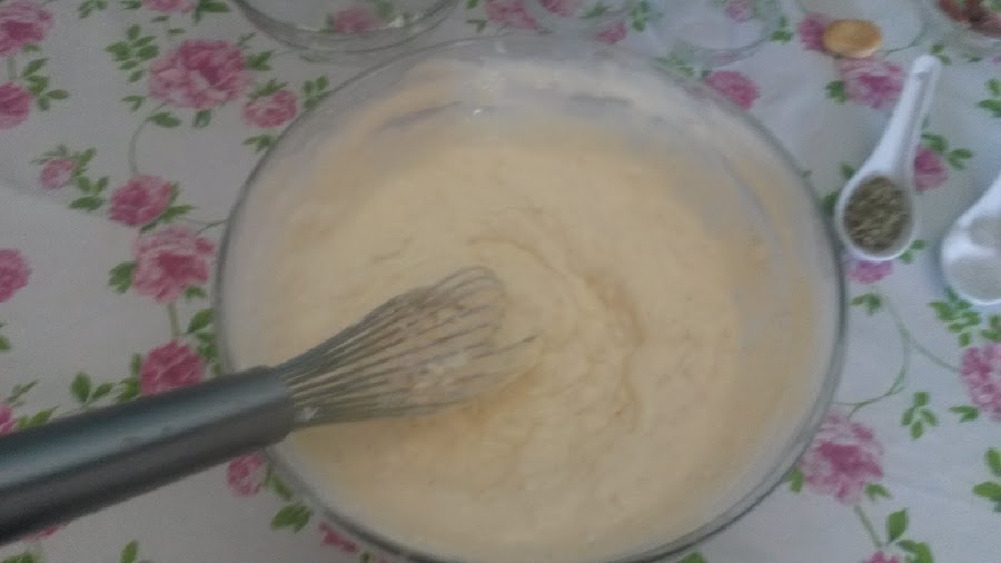 Elaboramos el relleno batiendo los dos huevos y meclándolos con el queso crema y el queso rallado. Salpimentamos.