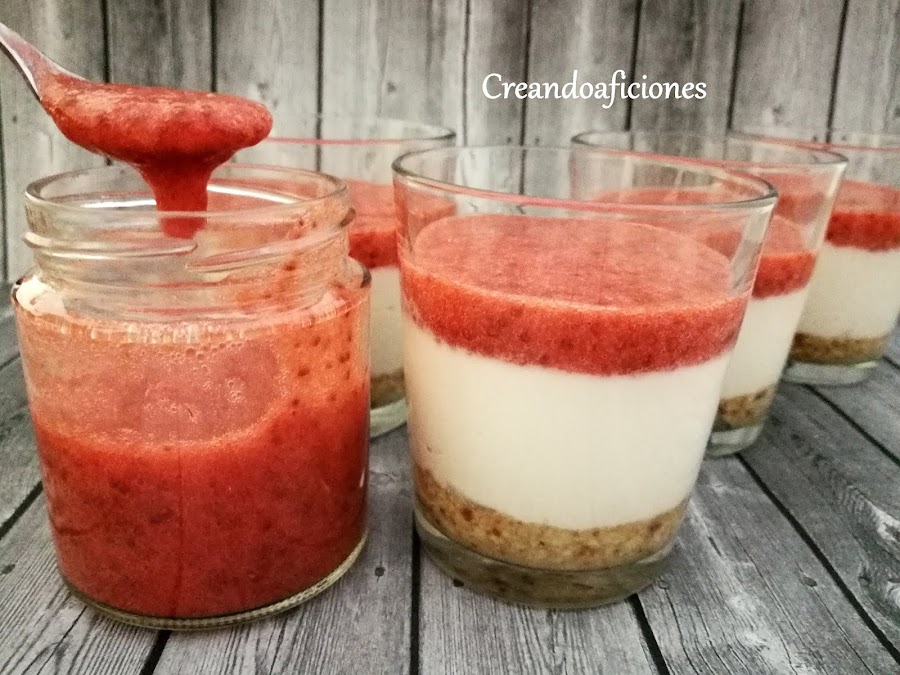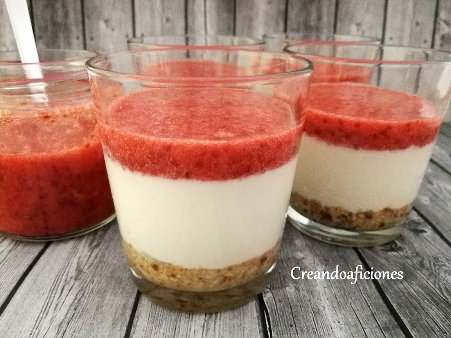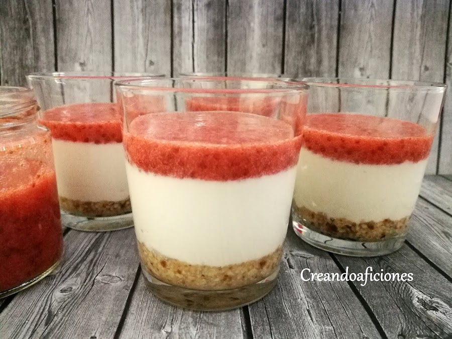 Cogemos los vasos y echamos el queso fresco batido encima de la base.