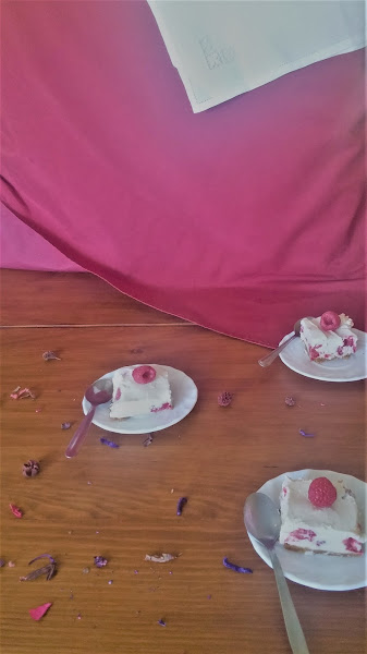 Reservamos algunas frambuesas para la decoración como unos 50 gramos y el resto lo repartimos bien por todo el molde presionando un poquito para que se hundan.