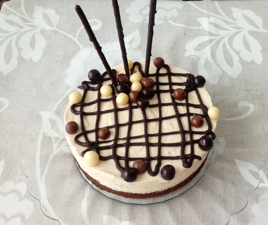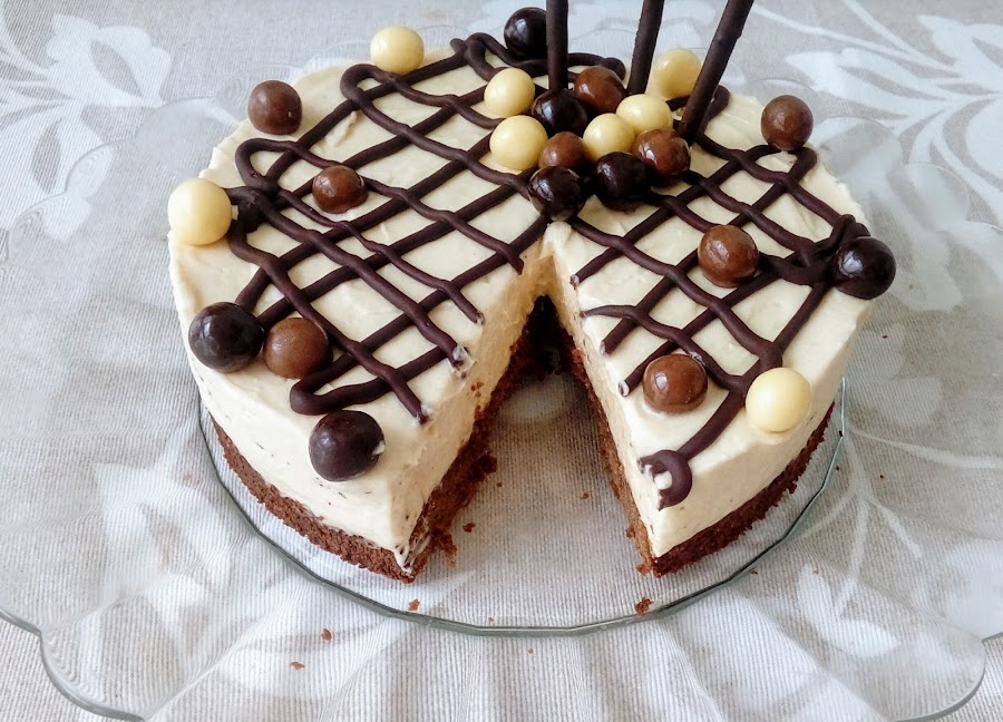 Lo sacamos del frigorífico y lo decoramos, para eso calentamos unas onzas de chocolate negro con un poco de nata (crema de leche). Con una manga pastelera hacemos lineas con el chocolate sobre la tarta.