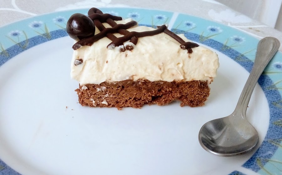 Cuando esté el brownie listo y frío sin sacarlo del molde se vierte encima la crema de queso, se extiende bien para que quede lisa la superficie,. se introduce en el frigorífico durante 4 horas para que se endurezca.