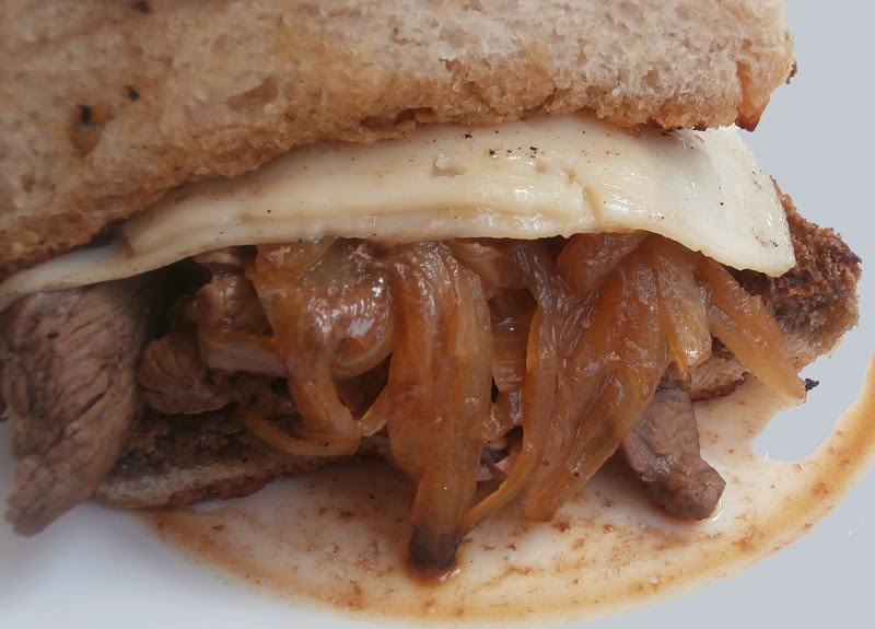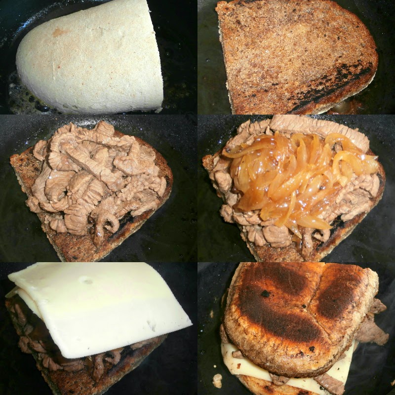 Pones el pan boca arriba en la sartén, pones encima una cuarta parte de la carne, salsa de la sartén de la carne, un cuarto de la cebolla y dos lonchas de queso. Lo tapas con la otra parte del pan y le das la vuelta, para que se tueste la otra mitad del pan y se derrita el queso