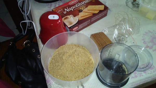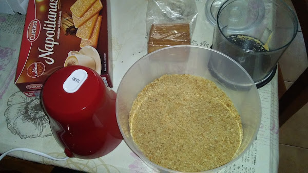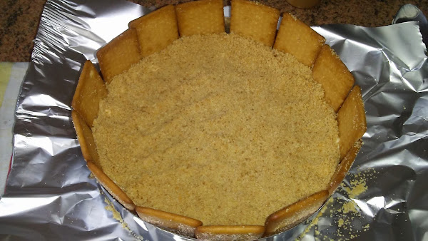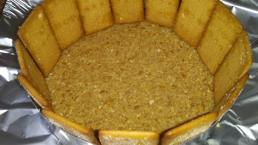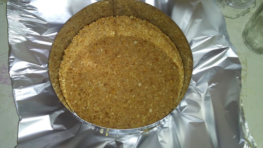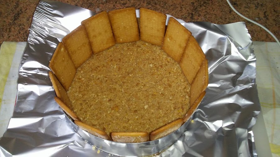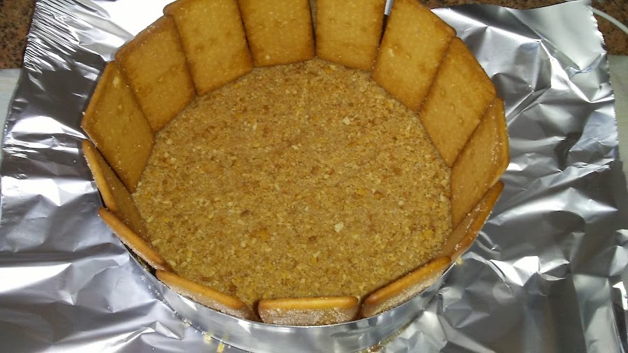 Picar las galletas y hacer dos particiones, una la mezclamos con mantequilla y la ponemos en el fondo del molde de 20 cm sobre un papel de aluminio o papel de horno, apisonamos el fondo de galletas y reservamos en el frigorífico.