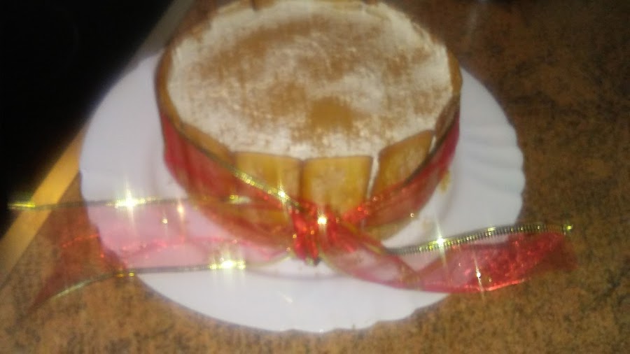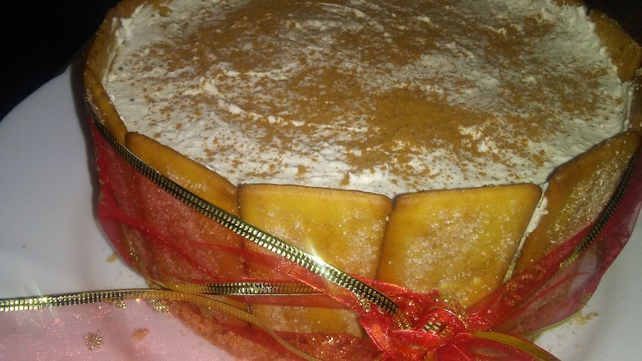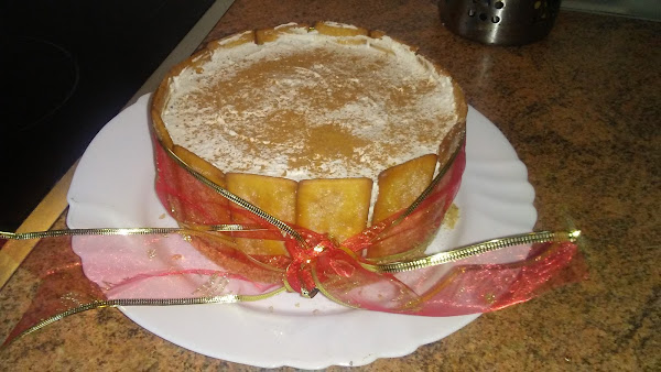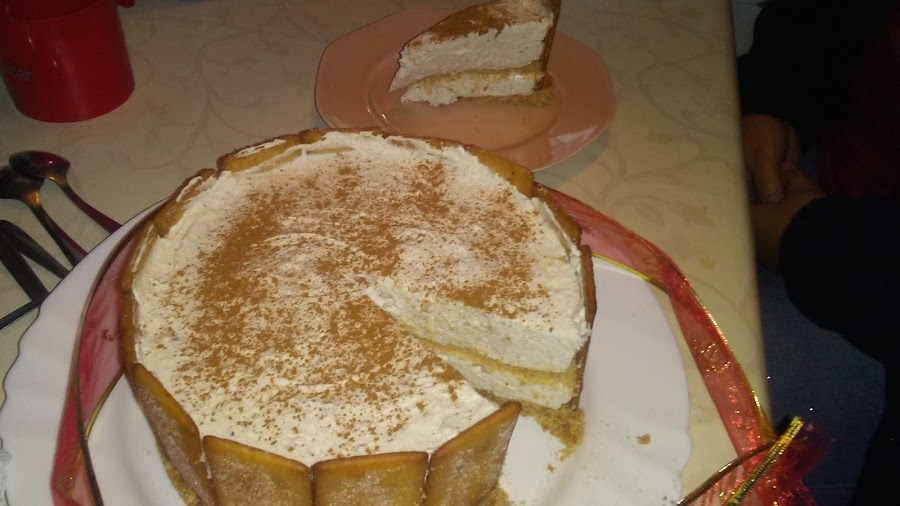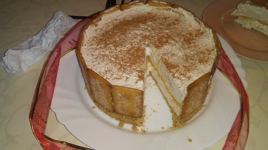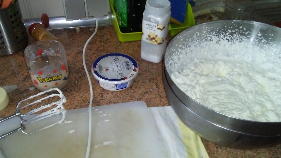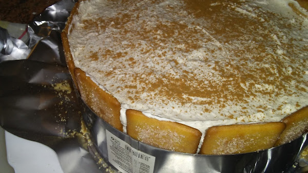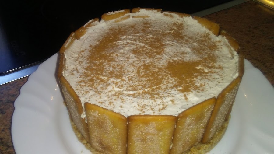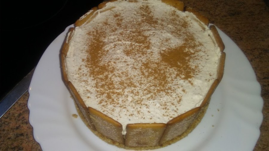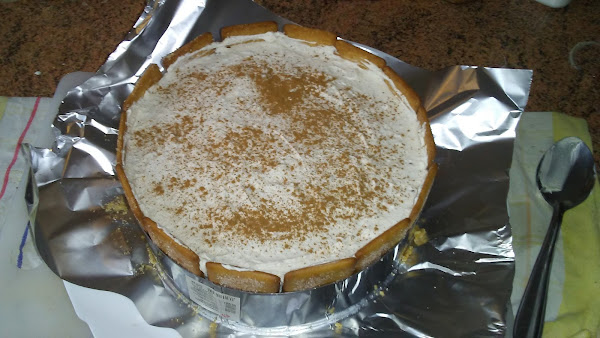 Montar la nata (crema de leche) con azúcar glass hasta punto de nieve , porque cuando añadamos la leche con la gelatina y la canela se va a volver más líquida, añadimos el queso mascarpone y la leche con gelatina y canela y batimos para homogeneizar la mezcla. Colocamos galletas de pie alrededor del molde.