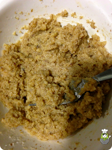 Mientras tanto vamos a preparar el relleno. Trituramos la nuez (o compramos directamente nuez molida) y la mezclamos con el azúcar, el anís y el huevo batido. Podemos ayudarnos de los dedos y amasar un poco la mezcla.
