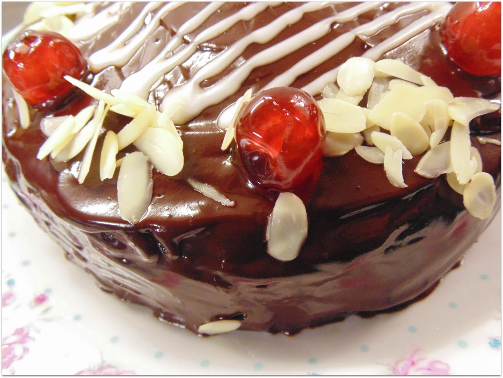 Decoramos con cerezas, láminas de almendra y el glaseado. Éste lo elaboré mezclando 3 cucharadas de azúcar glass y 1 de agua. Podéis añadir más azúcar o agua en función de lo espeso o líquido que lo queráis.