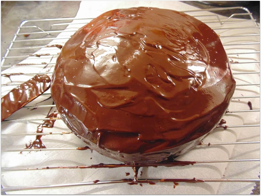 Dejamos enfriar y preparamos la cobertura calentando la nata (crema de leche) hasta que comience a hervir y vertiéndola sobre el chocolate troceado en un cuenco. Agregamos cucharada golden syrup o miel de caña. Vertemos sobre nuestro pastel.