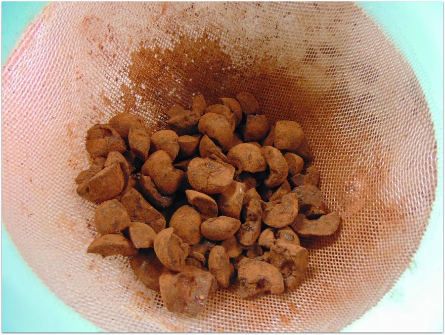 Ahora es le turno de las cerezas. Si son glaseadas las secamos con una servilleta o paño y si son en almíbar escurrimos y secamos. Las partimos en 4 trocitos cada una para que no se nos queden en el fondo del pastel y las espolvoreamos con cacao en polvo.